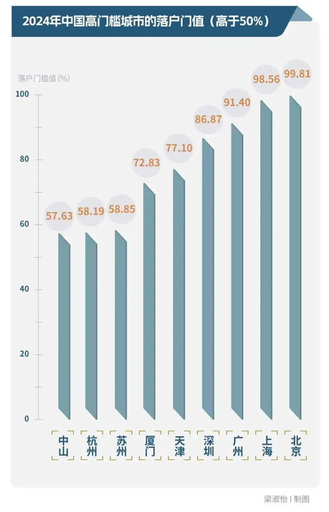 这与《经济学(季刊)》论文的结论基本一致,落户门槛仍高于50%的只剩下9座:北京、上海、广州、深圳、天津、厦门、苏州、杭州、中山。