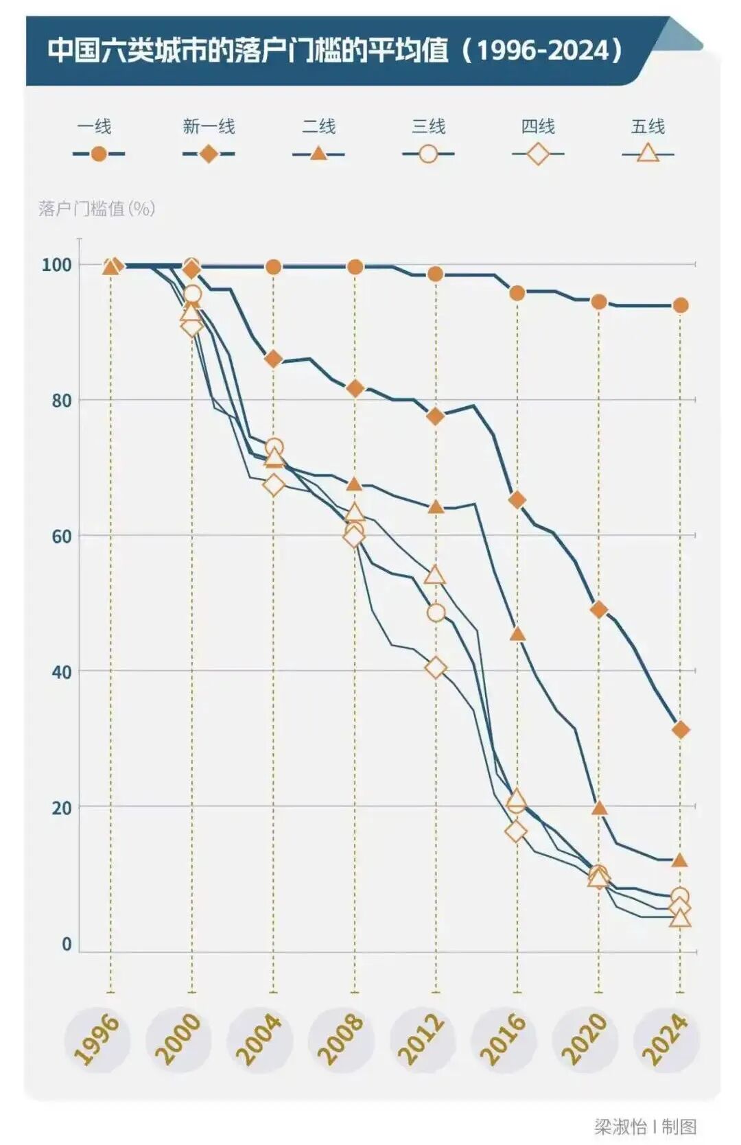 全国落户门槛加权均值从1999年的98.8%下降到了2024年的12.6%。