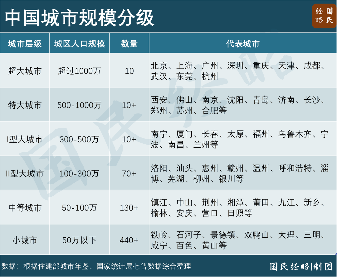 按照城区人口规模不同,可分为“超大-特大-大-中小城市”,超大城市涵盖北上广深成渝津杭等地。