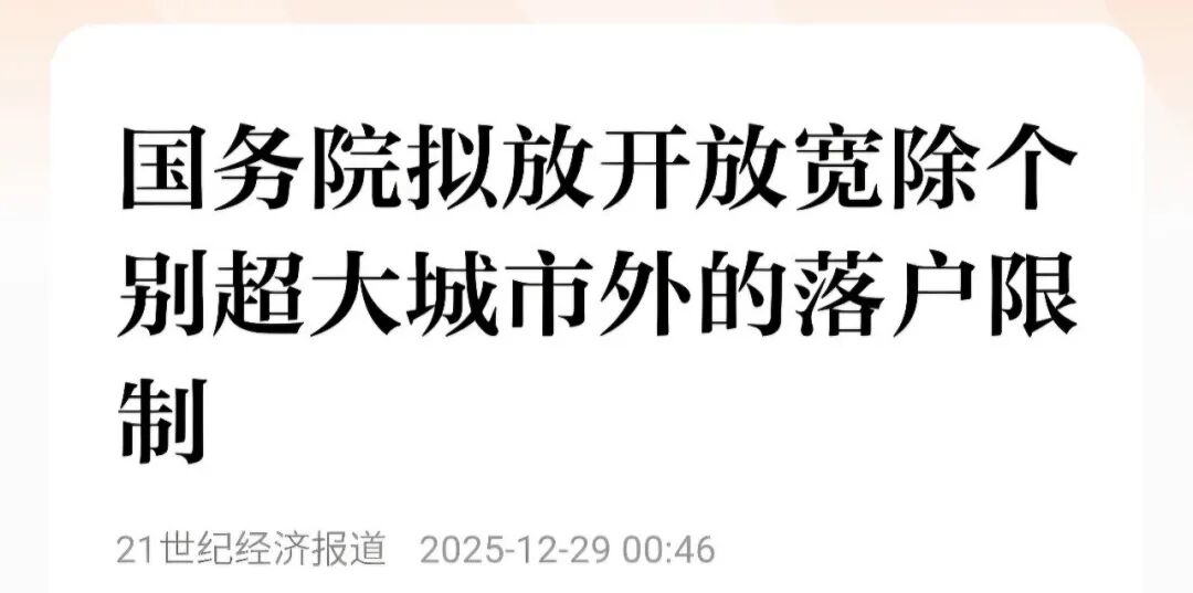 据报道,国务院拟放开放宽除个别超大城市外的落户限制,推动转移人口社保、住房保障、教育享有同等权利。
