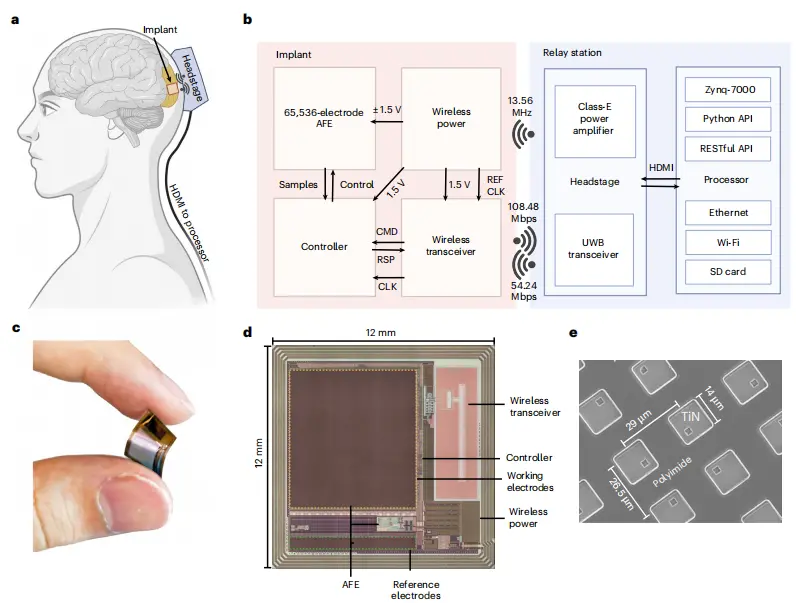 该系统包括一个单芯片植入体、一个可穿戴式转发器以及操作系统所需的定制软件。系统的核心由 CMOS 芯片构成,厚度仅 50 微米,比一根头发丝还薄,并集成了 65,536 个微型电极、信号供电电路、无线收发器、数据转换和模拟电路等。