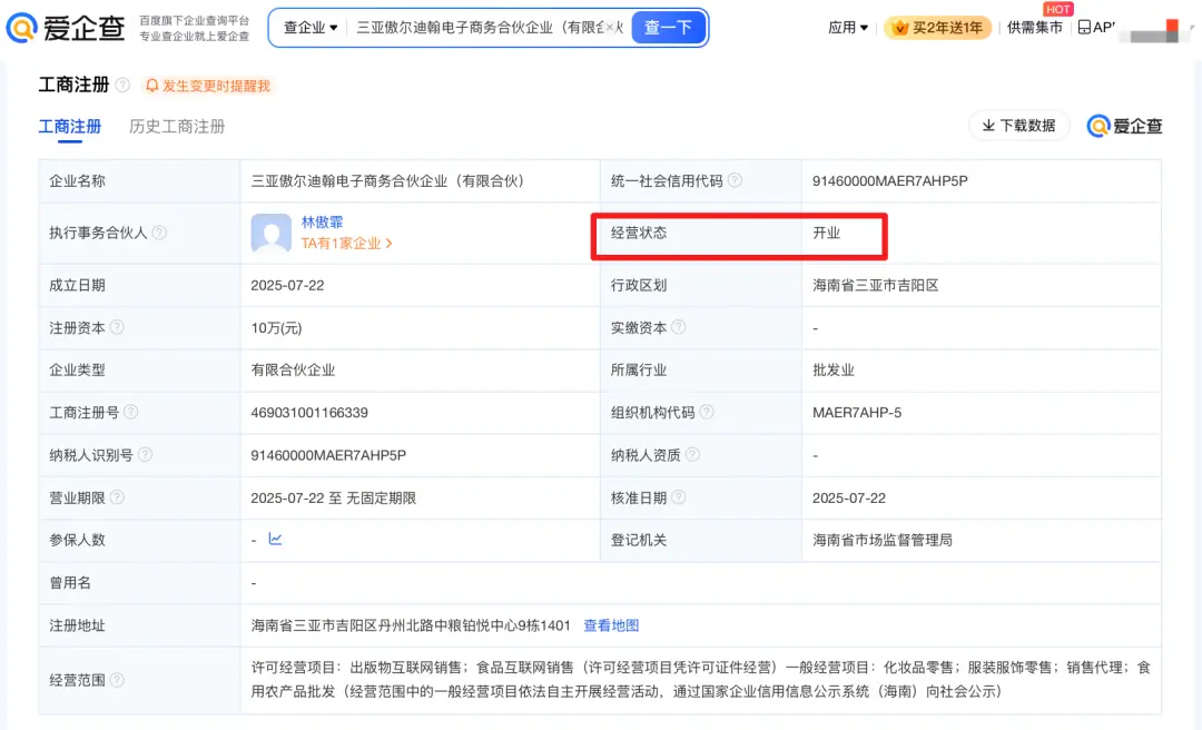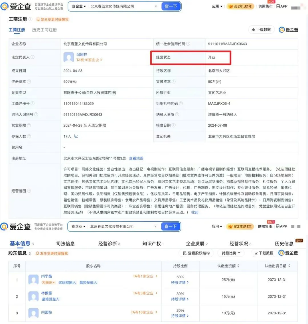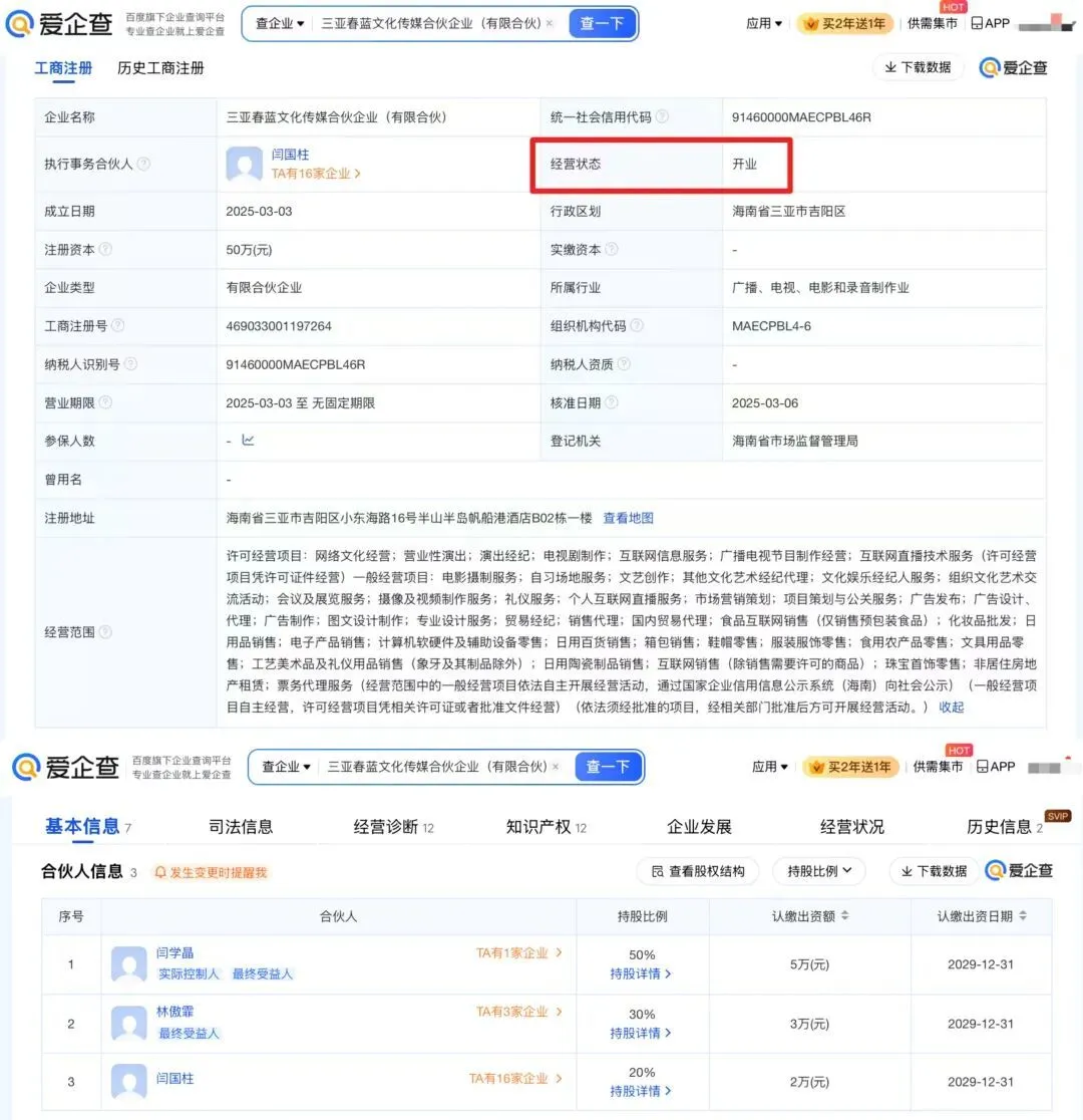 爱企查App显示,闫学晶名下共关联2家开业企业,均为她与儿子林傲霏的合作企业,具体为北京春蓝文化传媒有限公司、三亚春蓝文化传媒合伙企业(有限合伙)。林傲霏名下共关联3家开业企业,除上述的2家开业企业,还有三亚傲尔迪翰电子商务合伙企业(有限合伙)。