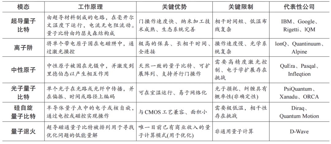 由于量子计算行业尚处于新兴阶段,如今的量子设备采用的量子比特物理系统差异极大,详见Box“量子模式的比较:从量子比特到架构”。目前尚无明确迹象表明,这些平台中是否会有某一种最终成为主流。