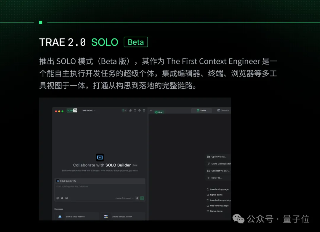 推出了SOLO模式的Beta版。这时候,TRAE开始像是有了独立人格,被称为The First Context Engineer。它集成了编辑器、终端、浏览器,试图打通从构思到落地的链路。
