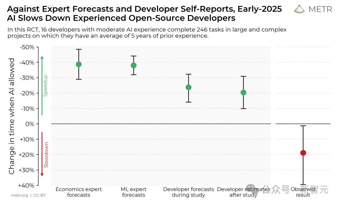 METR于2025年初进行的随机对照实验显示,在复杂真实任务中,允许使用AI的资深开源开发者平均完成时间反而更长。尽管如此,专家与开发者在事前与事后的主观预测仍普遍高估AI带来的效率提升。