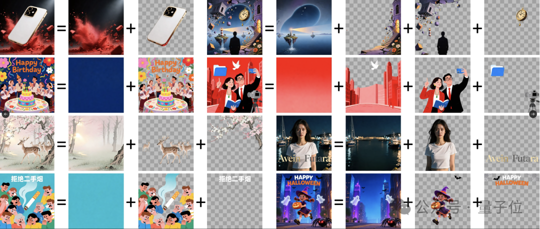 在官方案例中,一张完整图片输入之后,模型会自动把画面拆成6个包含不同元素的图层,背景是背景,人物是人物,装饰是装饰,互不干扰。