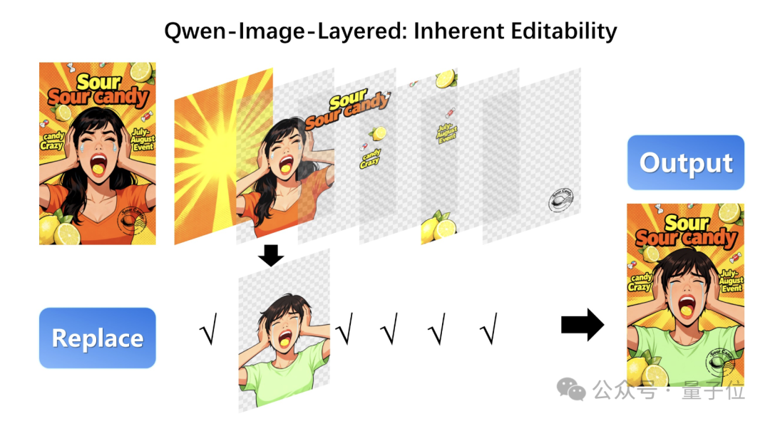 除了基本的替换编辑功能外,Qwen—Image—Layered模型还支持调整元素的大小、删除不想要的元素等等。