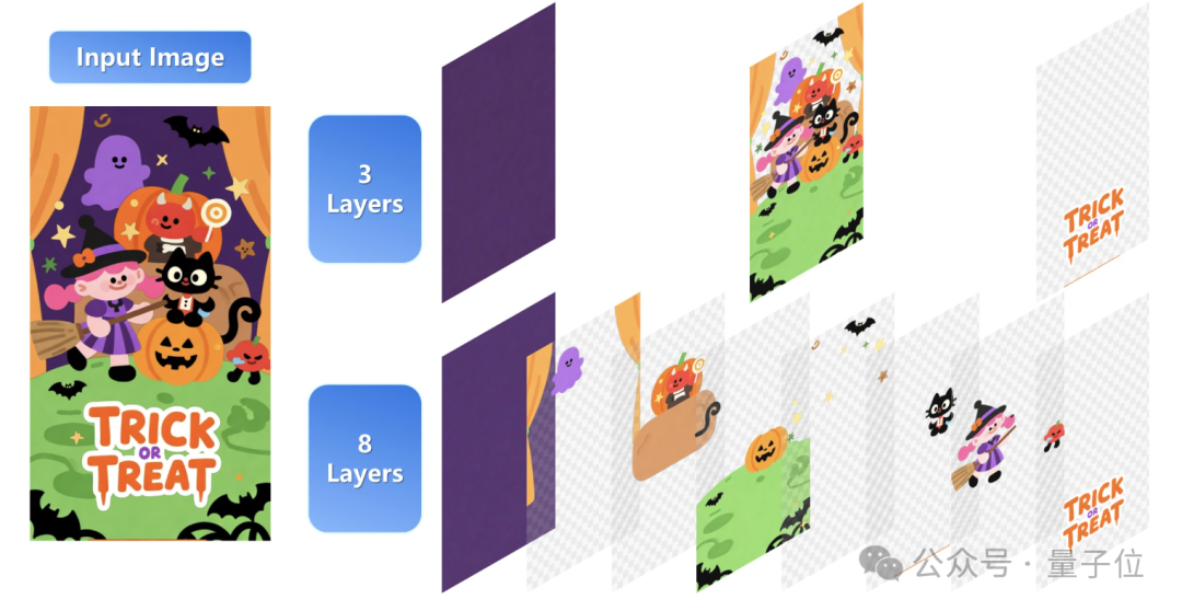 值得注意的是,Qwen—Image—Layered模型分层不限于固定的图层数量,支持可变层分解,例如我们可以根据需要将图像分解为3层或8层: