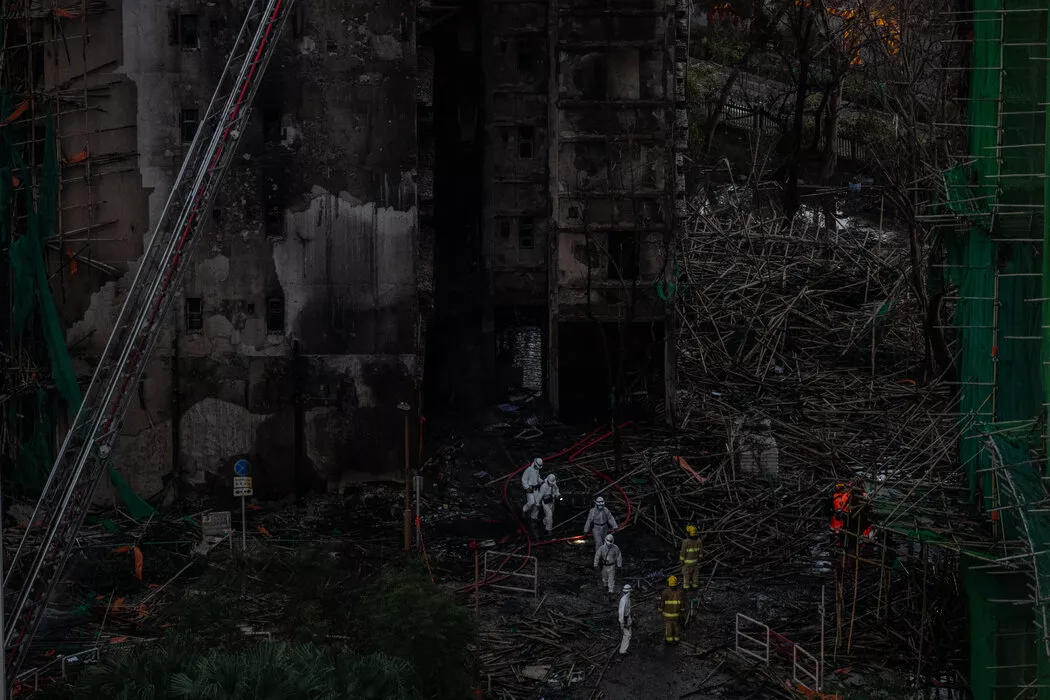 香港宏福苑,摄于11月26日的大火数天后。火灾造成161人死亡、数千人无家可归。
