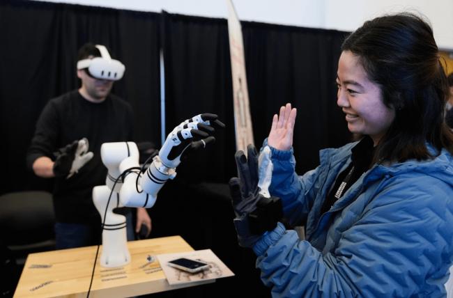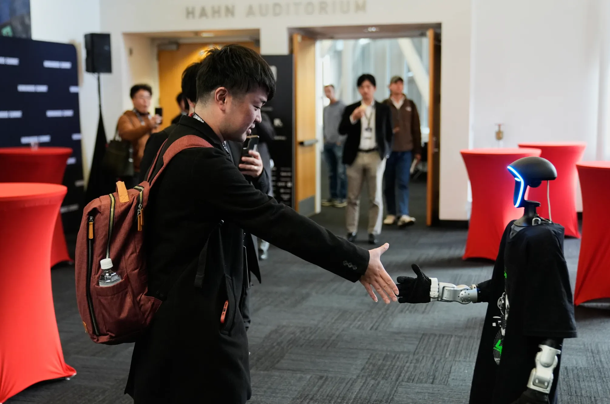 2025年12月11日,在加州山景城举行的人形机器人高峰会上,一名男子在展场内与机器人握手。 (美联社)