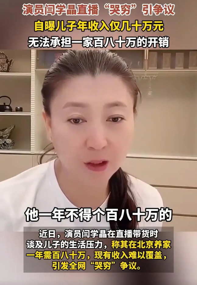 近日,闫学晶在直播间透露她32岁的儿子年收入仅几十万元,却需负担家庭年开支80万元至100万元,否则家庭无法运转,其哭穷内容引发不少网友的质疑与争议。