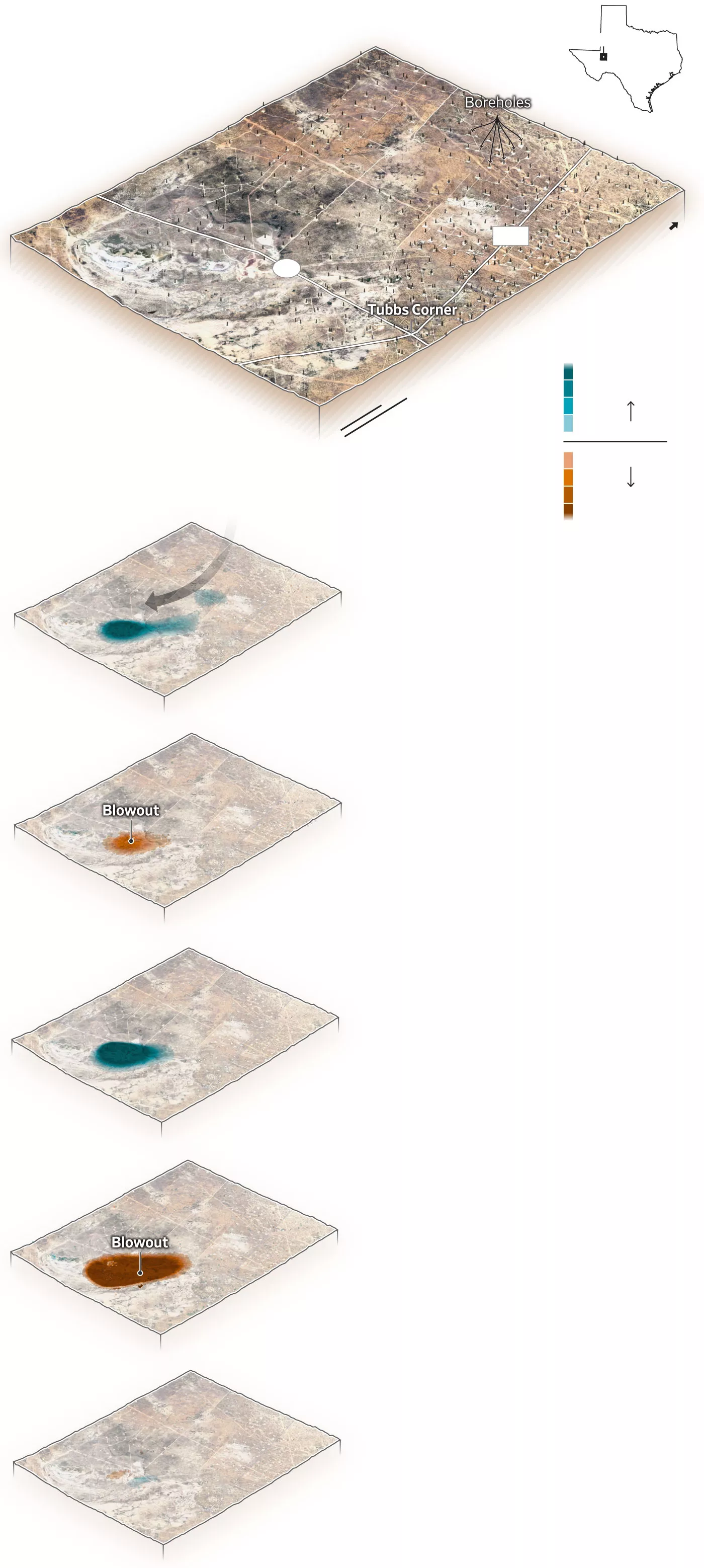 2022年,在得克萨斯州克雷恩县靠近非建制社区Tubbs Corner的一个废弃油井中,一股100英尺高的盐水柱喷涌而出。雪佛龙应得克萨斯州铁路委员会的要求对其进行了封堵,该公司表示并不拥有该油井。但科学家们说,近两年后,同一地区的另一口井开始渗水,这表明封堵那处喷涌点很可能使地下重新承压,并引发了新的喷发。