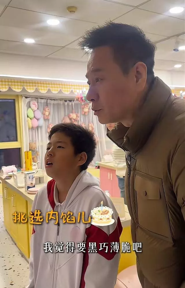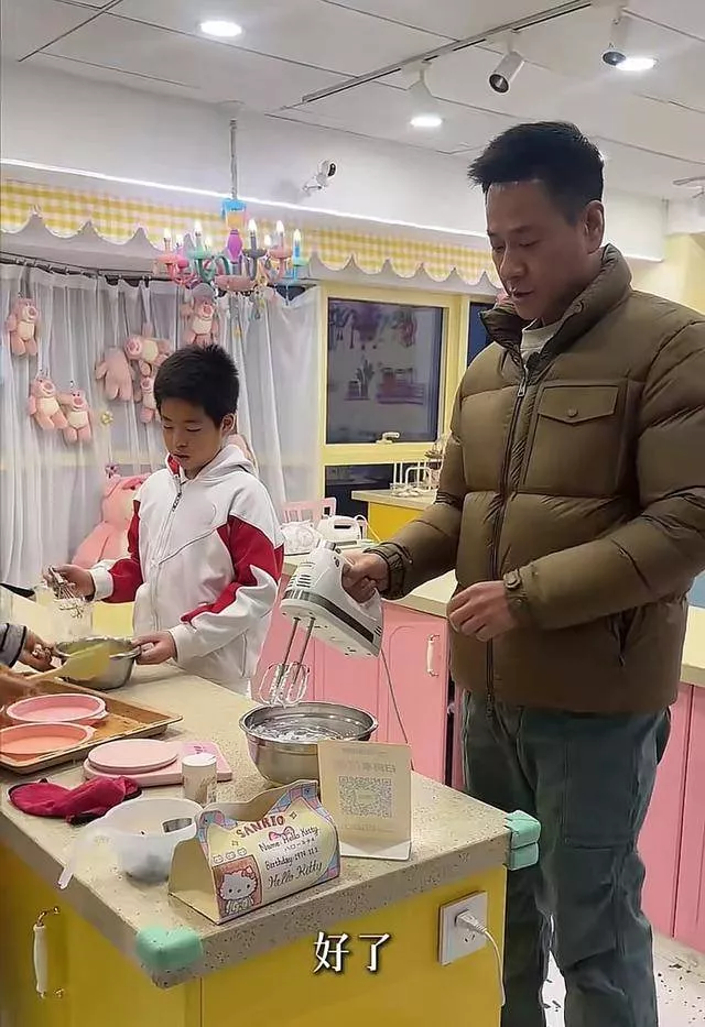 连奕名没有选择奢侈品。他带着儿子钻进DIY蛋糕店。这位荧幕硬汉系着围裙,和儿子头碰头守在操作台前。