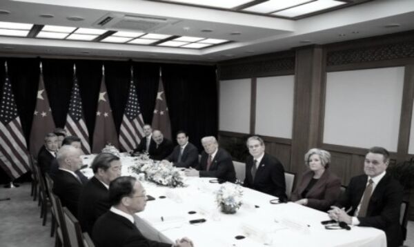 美国总统川普(中)和中共党魁习近平于2025年10月30日在韩国釜山金海空军基地举行双边会晤。(Andrew Harnik/Getty Images)