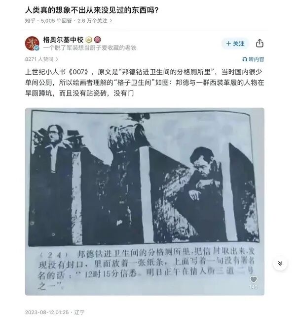 类似的这种小画书还有很多,比如80年代画的007的小人书,邦德躲进一个厕所,一群外国老白男蹲在一起,厕坑没有门。