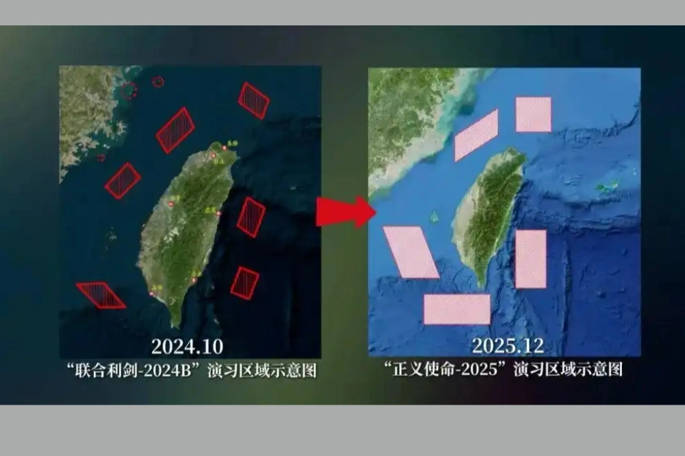 解放军“联合利剑-2024B”及“正义使命-2025”演习范围比较。(取自百度)