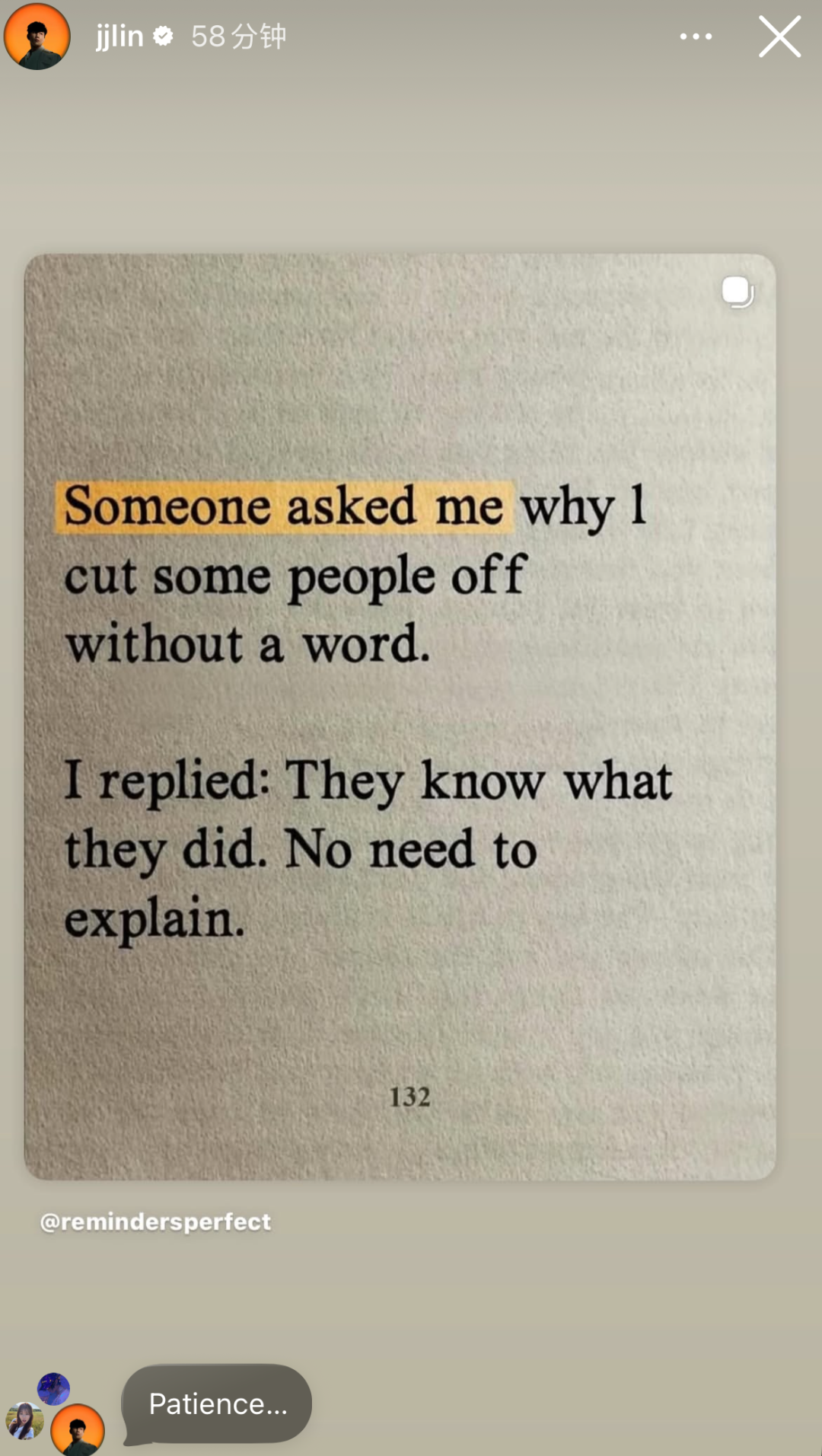 “有人问我为何悄无声息地与某些人断绝来往。我答道:他们心知肚明,无需多言。” 随后又在评论补充:“耐心……”