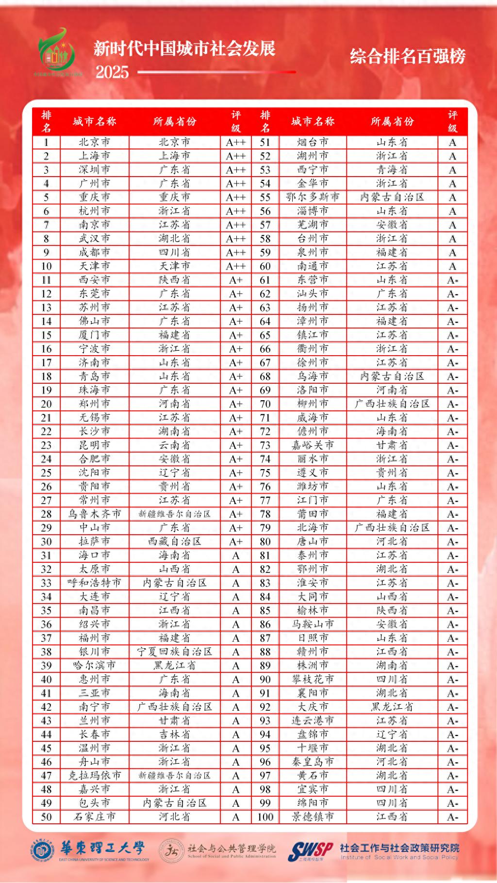持续第八年,中国城市社会发展百强榜公布。2025年12月29日上午,“中国城市社会发展指数研究”课题组在上海线上发布“新时代中国城市社会发展指数暨百强榜(2025)”,这是由上海高校智库“华东理工大学社会工作与社会政策研究院”何雪松教授和吴开泽研究员领衔的智库重点研究项目。根据“中国城市社会发展指标体系”,课题组利用可获得的2024年各类统计年鉴和统计公报数据,对全国297个地级以上城市进行了排名。