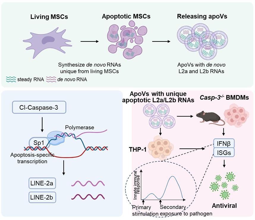 该研究以MSCs为模型,发现MSCs及其apoVs能够从头合成并传递凋亡新生RNA的新现象。凋亡MSCs合成与活细胞不同的特异RNA,包括大量非编码RNA如转座元件RNA、假基因RNA和miscRNAs等。凋亡MSCs特异转录的LINE-2a(L2a)和LINE-2b(L2b)RNAs可传递至 apoVs进一步发挥功能。研究探索了凋亡MSCs新生RNA依赖于Caspase-3/Sp1/RNA聚合酶II合成的新机制。研究还发现携带凋亡特异L2a/L2b RNAs的MSC-apoVs通过调节先天免疫稳态,预防水疱性口炎病毒感染的新功能。