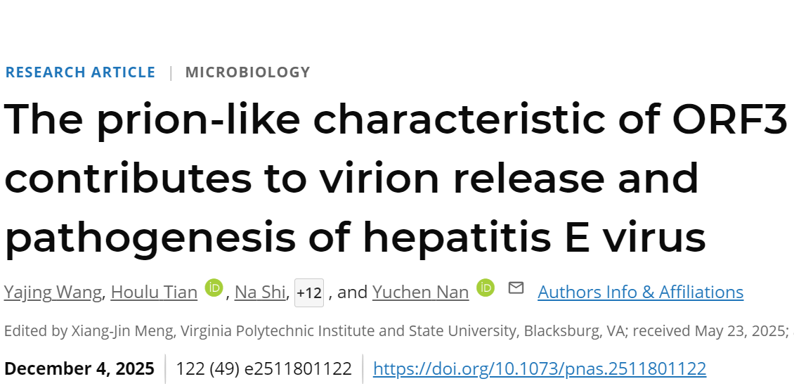 近日,西北农林科技大学动物医学院研究员南雨辰与生命科学学院教授陈红英等合作,在《美国国家科学院院刊》上发表论文。该研究首次发现戊型肝炎病毒(HEV)的ORF3蛋白具有类似朊病毒的自我增殖聚集能力,这也是首次在哺乳动物RNA病毒中鉴定出具有朊病毒样特征的蛋白。这一发现为理解HEV的致病机制提供了全新视角,也为相关药物研发提供了新的靶点。