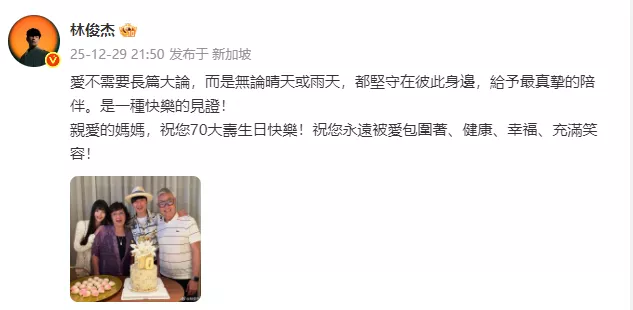 12月29日晚,林俊杰在母亲70大寿这天,首次公开与女友的温馨合照,正式官宣恋情,照片中四人笑容灿烂,引发全网热议和祝福。