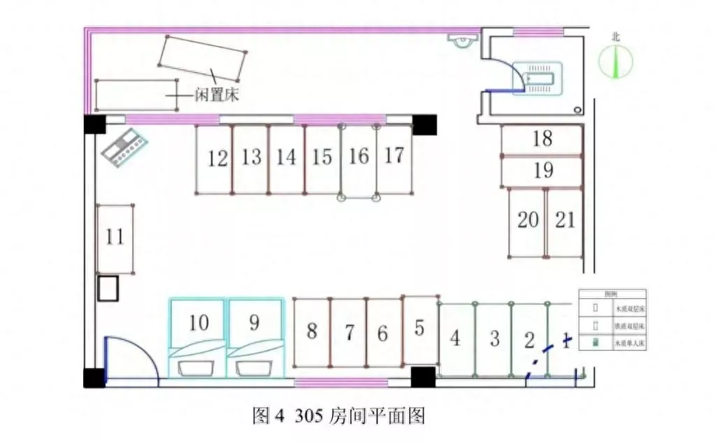 “床铺密集设置,上铺学生须爬梯下床,下铺学生须从床尾爬出。 起火房间有2个疏散门,东侧房门被床铺堵挡,中间床铺起火,部分学生只能穿过着火区域从西侧房门逃生。”