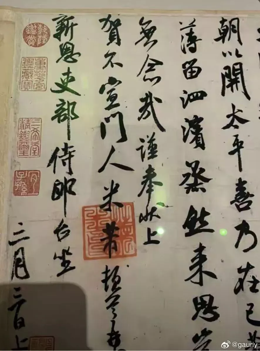 这是最致命的硬伤。有细心的观众发现,展品中出现了“字压印”的现象——也就是说,米芾的字,竟然“写”在了清朝收藏家的印章上面!