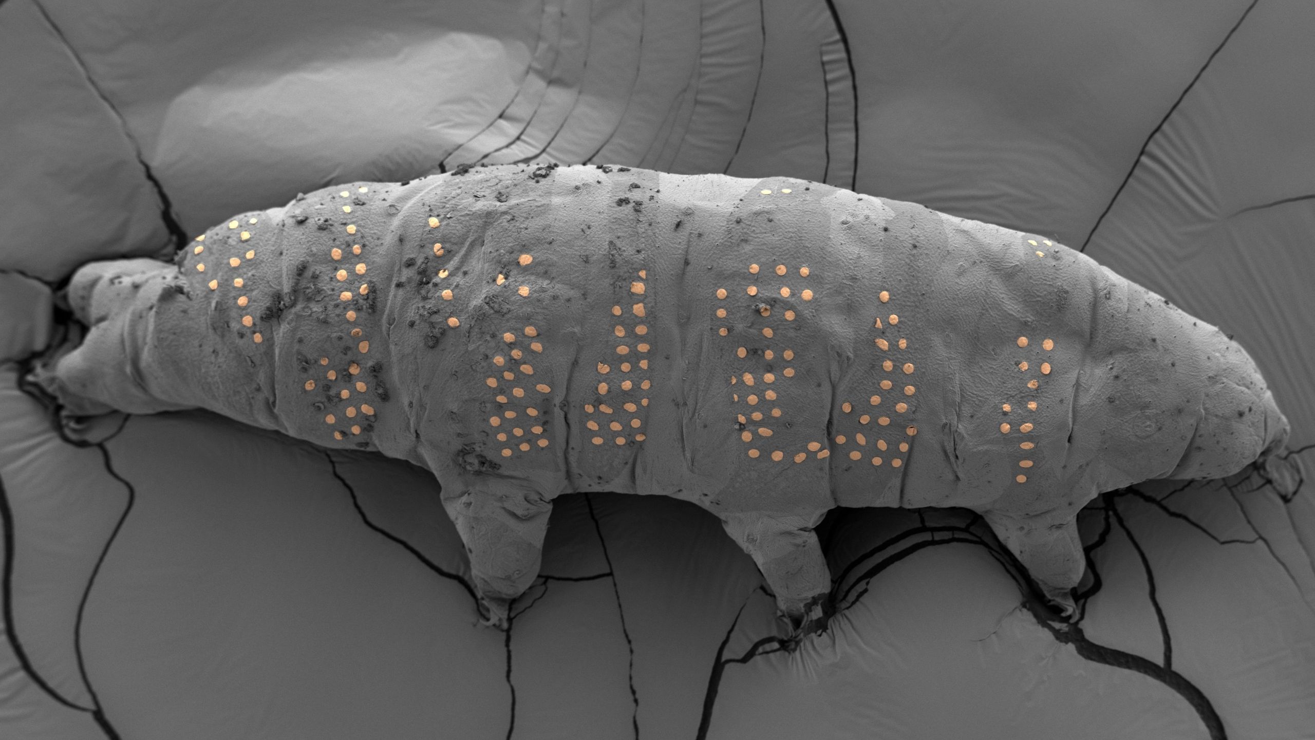 这只水熊虫身上或许装饰着世界上最小的“纹身”。研究人员利用电子束在覆盖该生物的冰层上蚀刻出圆点。电子束将这种物质转化为一种附着于水熊虫表皮的化合物,待冰层蒸发后,图案便清晰可见。开发该技术的科学家表示,这种方法具有极高精度,有望应用于生物医学工程领域。目前他们正尝试以相同方式为更微小的生物体施加纹身。图片来源: Z. Yang et al.