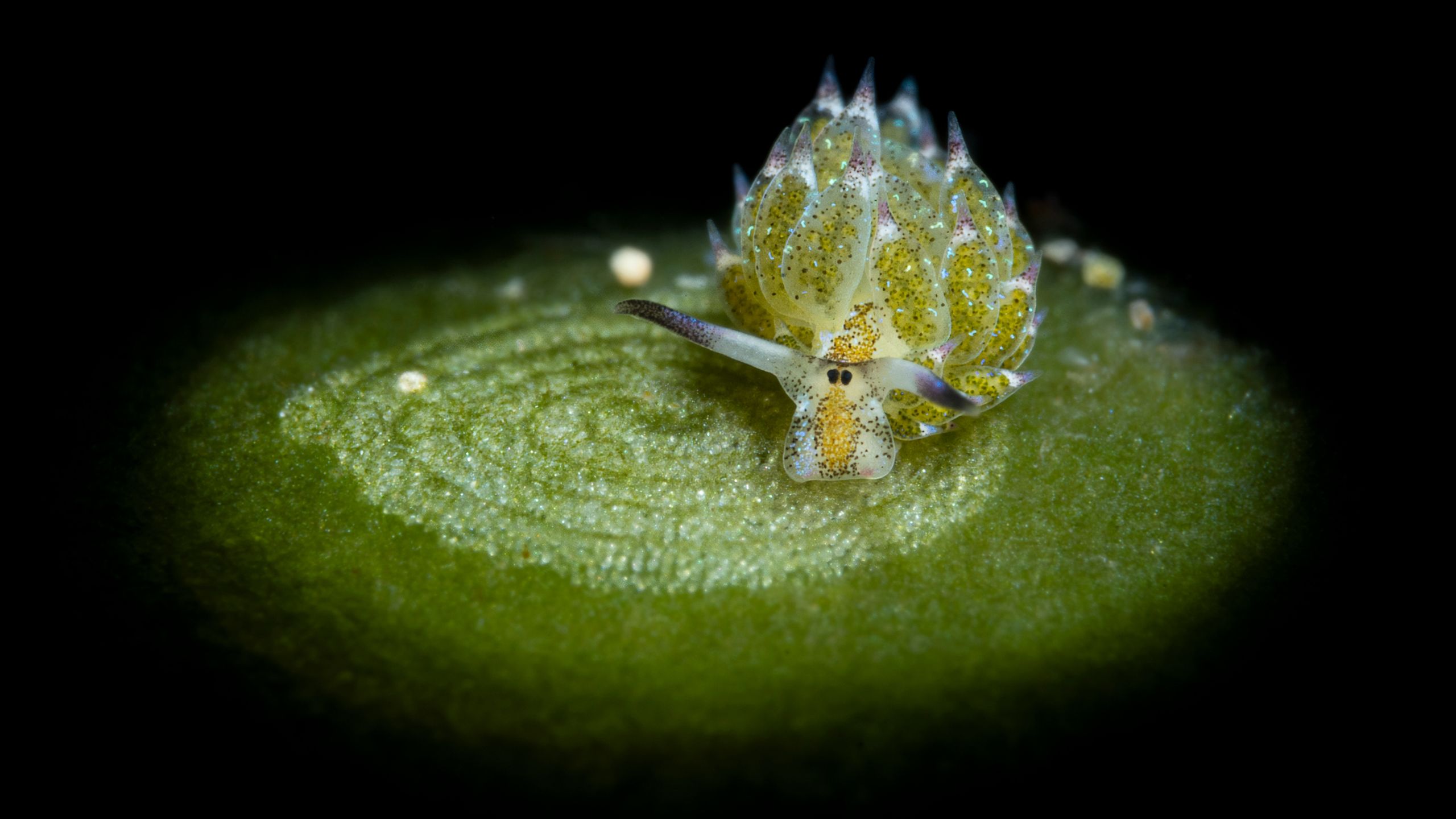 叶羊海蛞蝓(Costasiella kuroshimae)能以藻类为食,并将叶绿体储存在自身细胞中,这些叶绿体通过光合作用捕获阳光并产生能量。这种海蛞蝓因头部两侧形似羊耳的感官器官而得名。这张图片记录了它以螺旋状方式产卵的瞬间。图片来源:Giancarlo Mazarese