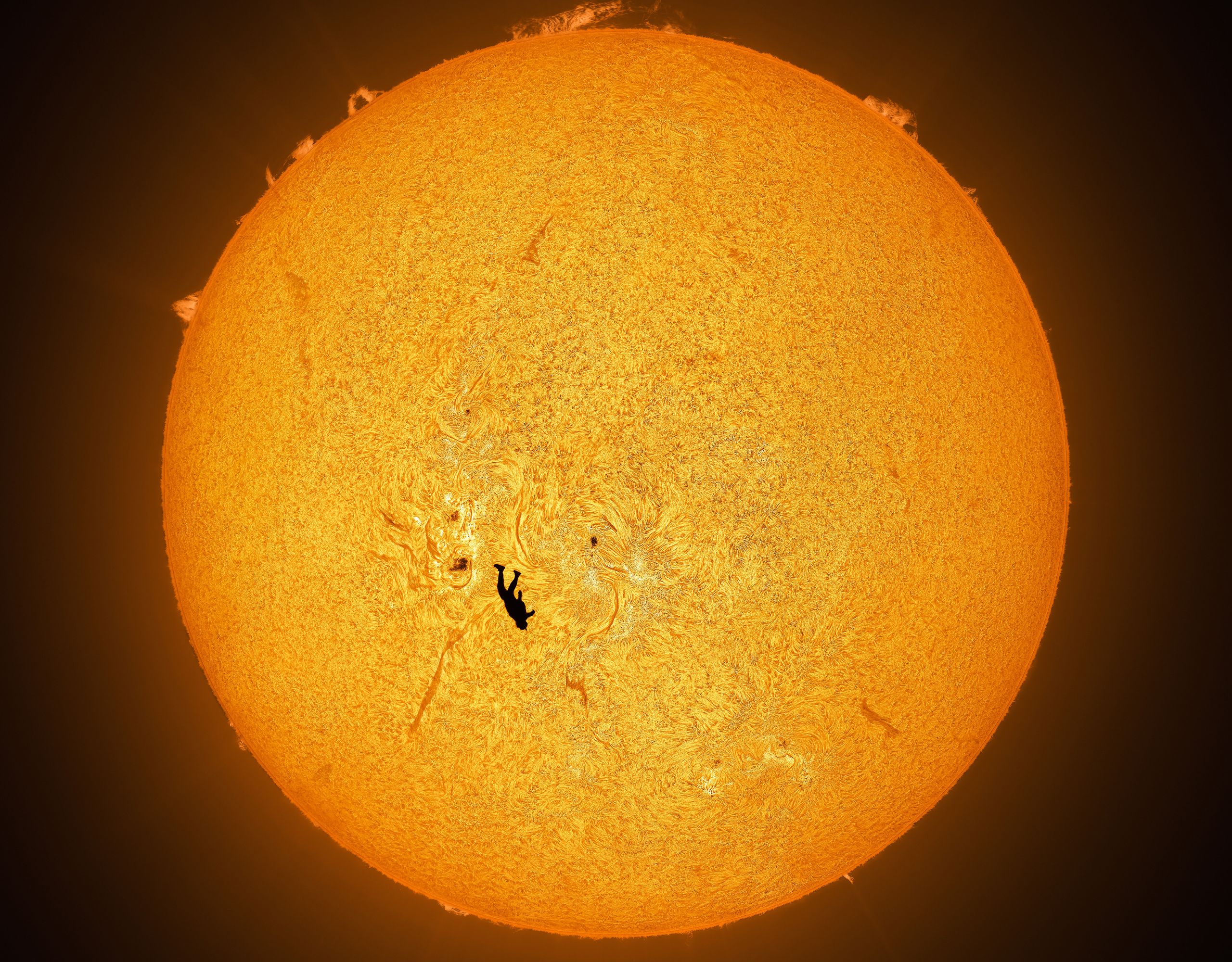 一名跳伞者纵身跃下,在太阳表面投下完美的剪影。背景中可见深色的太阳黑子,它们因强磁场阻挡了本应升至表面的热量而形成。摄影师与跳伞者耗费数月精心策划,通过精确的时机把握,借助特制太阳望远镜完成了这张震撼人心的作品。图片来源:Andrew McCarthy/cosmicbackground.io