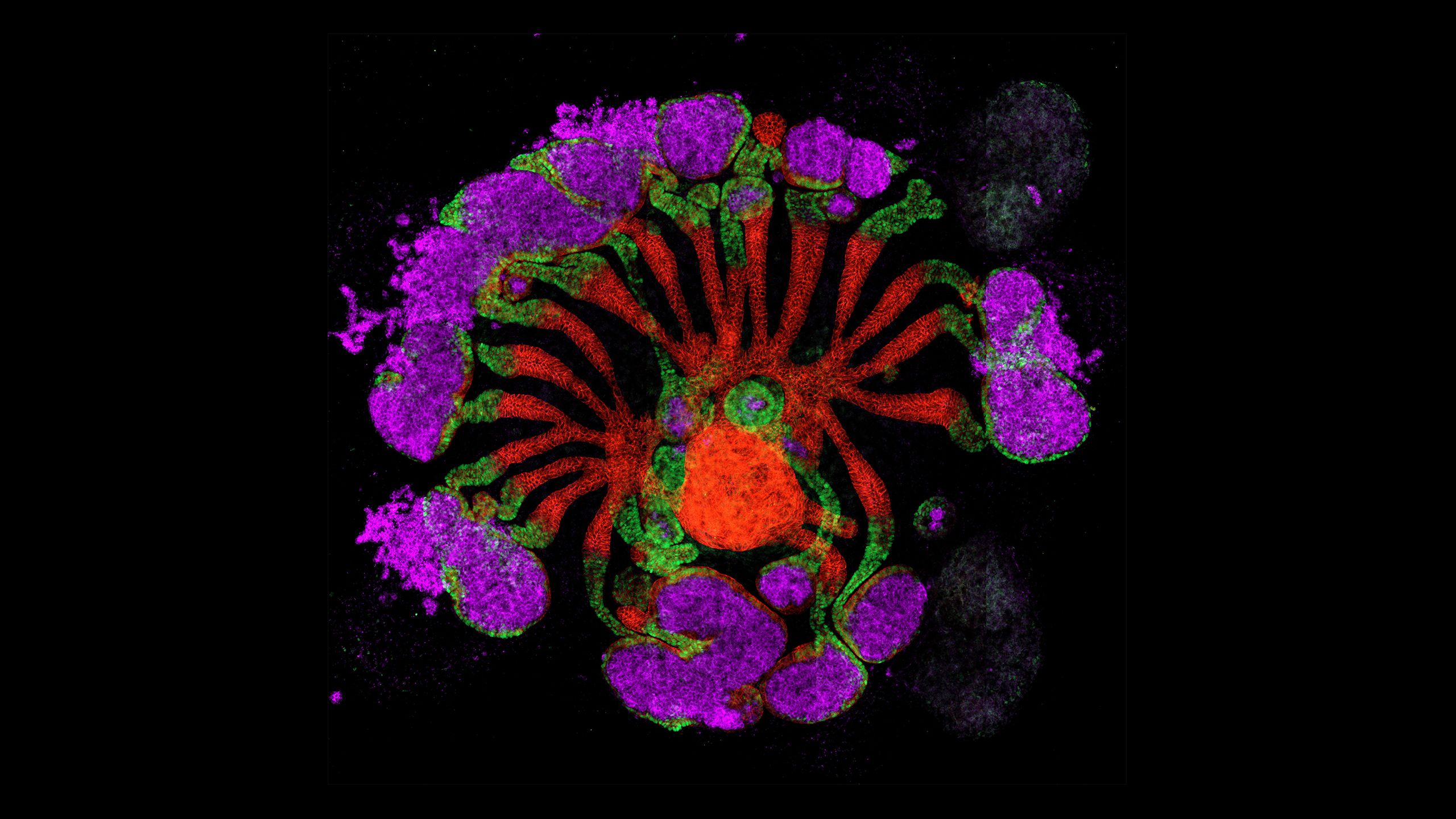 这种实验室培育的人造肾脏“组装体”是迈向人工肾脏的重要一步。微型过滤单元围绕中央引流管形成,其结构与真实肾脏相似。当移植到小鼠体内时,这些结构能够过滤血液并吸收蛋白质。图片来源:Pedro Medina/Li Lab