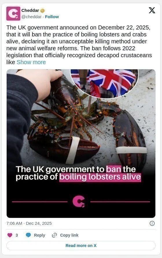 这项新政策源于英国2022年通过的一项法律。该法首次确认包括龙虾、螃蟹在内的无脊椎动物具有感知能力,能够感受疼痛。