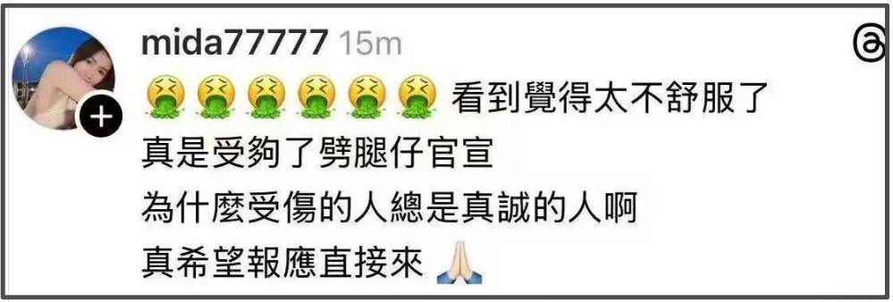 演员mida对林俊杰的官宣已经不是无语的程度,而是直接表示呕吐恶心!她发了6个呕吐表情包表达不满,写道:“看到觉得太不舒服了,真是受够了劈腿仔官宣,为什么受伤的人总是真诚的人啊,真希望报应直接来。”搭配了一个拜托的表情包。