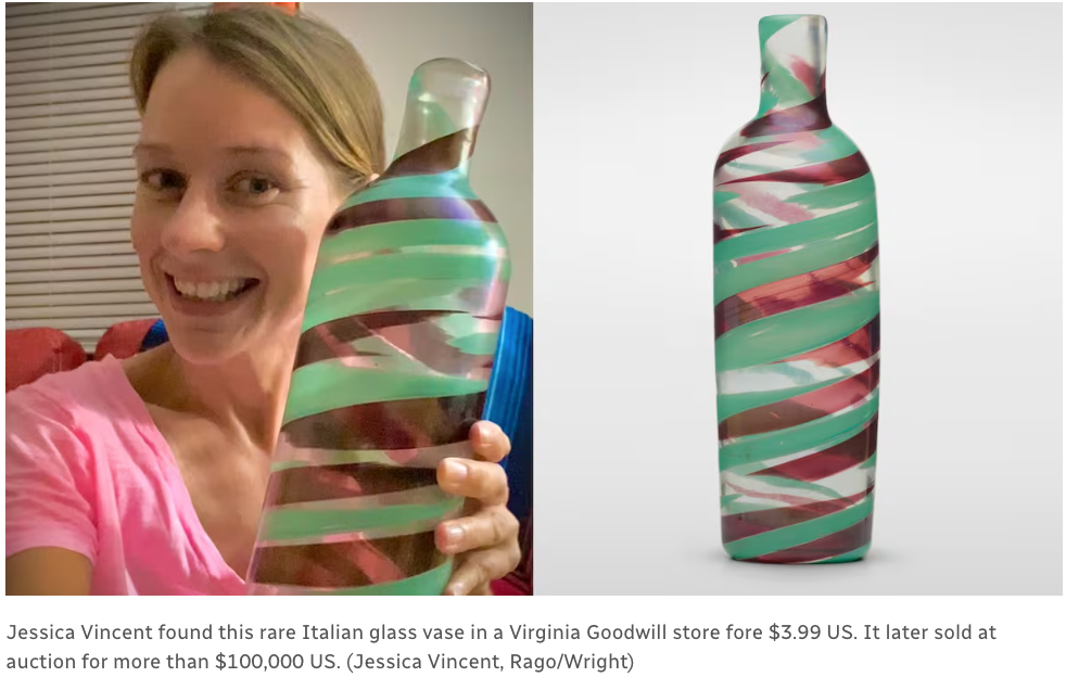 加拿大国家广播公司报道了一起真实案例:一名女子在二手店花 3.99 美元(约 5.34 加元)买下一个看似普通的玻璃花瓶,随后在专业拍卖行以 107,100 美元(约 143,370 加元)成交,价格翻了将近 2.7 万倍!