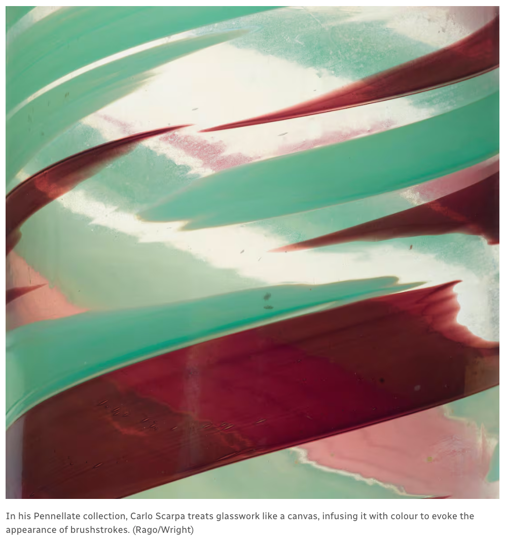 “Pennellate”在意大利语中意为“笔触”。在这一系列中,Scarpa 将彩色不透明玻璃在吹制过程中融入透明玻璃,使花瓶表面呈现出类似画布刷痕的视觉效果。拍卖行后来评价,这种处理方式让玻璃不再只是容器,而更像一件可被“阅读”的艺术作品。