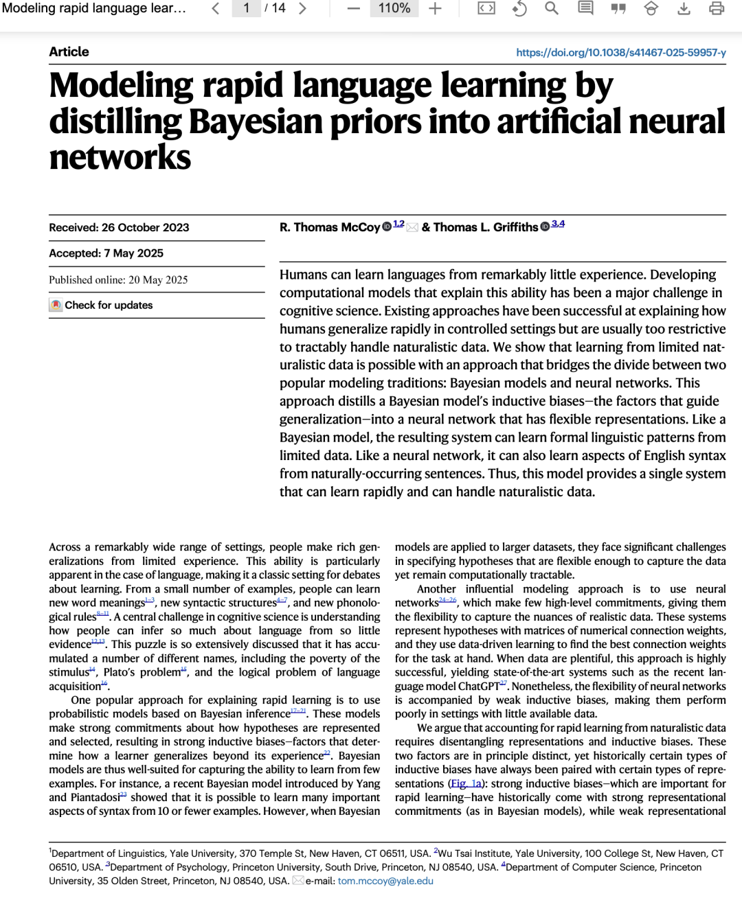 在极其广泛的情境中,人们能够从有限的经验中做出丰富的泛化。这种能力在语言领域尤为明显,使语言成为关于学习机制争论的经典场景。仅凭少量例子,人们就能学习新词的含义¹⁻³、新的句法结构⁴⁻⁷以及新的音系规则⁸⁻¹¹。认知科学的一个核心挑战,就是理解人们如何能从如此稀少的证据中推断出如此丰富的语言知识¹²,¹³。这一难题已被广泛讨论,因而积累了多个不同的名称,包括“刺激贫乏论”(poverty of the stimulus)¹⁴、“柏拉图问题”(Plato’s problem)¹⁵,以及“语言习得的逻辑问题”(the logical problem of language acquisition)¹⁶。