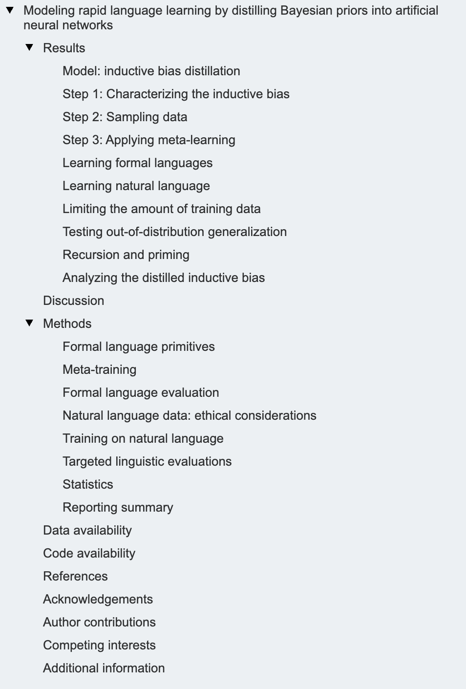 我们使用这种方法构建了一个语言学习模型。之所以选择这一案例,是因为语言学习是一个经典问题,长期以来被认为需要结构化的符号表征,因此对基于神经网络的方法构成了严峻的考验。在数据有限的情境下(例如从小量例子中学习人工形式语言),我们模型的表现接近 Yang & Piantadosi 的贝叶斯学习器——该模型是首个被证明能在未针对特定语言现象进行大量定制的情况下,仅凭有限数据学会此类语言的模型。因此,尽管我们的模型是一个神经网络,但其蒸馏而来的归纳偏置使其在神经网络通常难以胜任的环境中取得了成功,达到了此前只有使用符号表征的模型才能实现的性能水平。此外,由于我们的模型本质上是神经网络,它还足够灵活,能够处理贝叶斯模型难以应对的情境:从一个包含 860 万词的语料库中学习英语句法的某些方面。我们的结果表明,融合贝叶斯模型与神经网络各自优势不仅是可能的,而且具有显著益处。