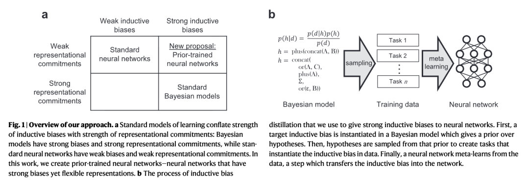 在本研究中,我们展示了如何将贝叶斯模型的归纳偏置“蒸馏”(distill)到神经网络中。我们的方法利用了元学习(meta-learning)领域近期²⁸,²⁹的技术进展。元学习是一种机器学习技术,系统通过接触多种任务,自动发现一种归纳偏置,从而更轻松地学习新任务³⁰,³¹。在我们的元学习应用中,这些任务是从一个贝叶斯模型中采样的,从而将该贝叶斯模型的归纳偏置蒸馏到神经网络中。我们将这一过程称为“归纳偏置蒸馏”(inductive bias distillation),其结果是一个兼具贝叶斯模型强归纳偏置和神经网络灵活性的系统。