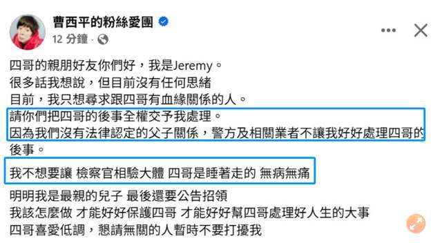 他在曹西平的粉丝账号中表示,恳求曹西平的家人能够出一份委托书,将其后事全部交给他处理。最后还无奈的感慨:明明我是最亲的儿子,最后还要公告招领,我该怎么做,才能保护好四哥,才能好好帮四哥处理好人生的大事.......