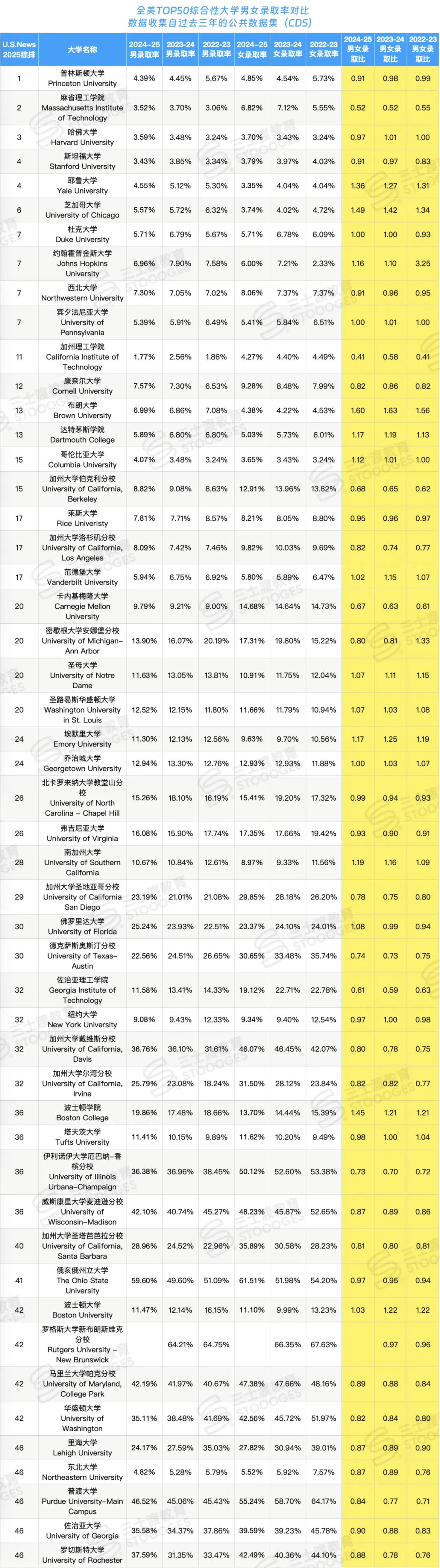全美Top50大学“男女录取率”红黑榜Stoooges三士渡