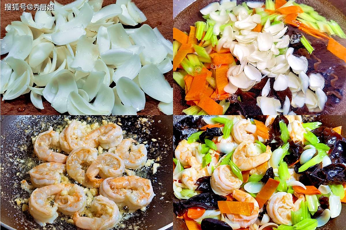 1. 鲜百合掰成片洗净(如果用干百合需要提前泡发);虾仁用少许料酒和胡椒粉腌制10分钟;芹菜切段,胡萝卜切片,木耳泡发后撕成小朵。