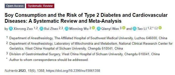 2023年,《Nutrients》杂志上发表的一篇研究显示,较高的大豆摄入和糖尿病、心血管疾病、冠心病以及卒中风险降低17%、13%、21%、12%有关。