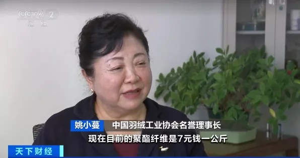 中国羽绒工业协会名誉理事长姚小蔓说:聚酯纤维的价格为7元/kg,和鸭绒价格悬殊大。(天下财经)