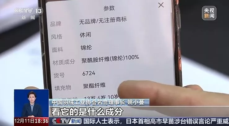 吊牌明确标注填充料为 “聚酯纤维”。(央视新闻)