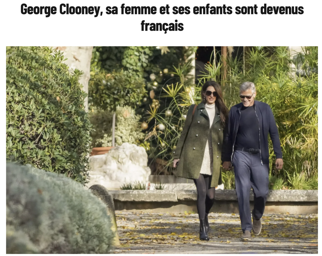 一个好莱坞老牌男神,一个英国—黎巴嫩背景的人权律师,再加上两个在伦敦出生的双胞胎孩子,全家一起,居然正式入了法籍,成为了法国公民。