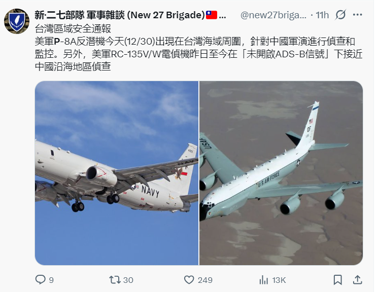美军持续关注中国近期军事演习动态,30 日,一架美军 P-8A「海神式」反潜巡逻机被发现在台湾(专题)周边海域活动,执行侦察与监控任务,外界研判与中共解放军相关军演有关。