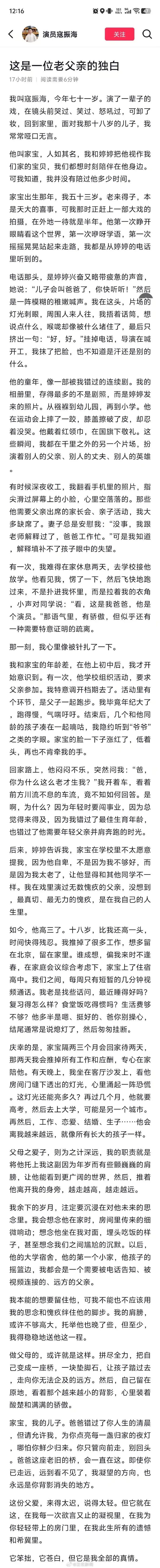 12月29日,演员寇振海发长文“这是一位老父亲的独白”。文中写到:自己今年71了,面对18岁的儿子常常哑口无言。老来得子,因为演戏错过了儿子的成长,也因为和儿子的年龄差让儿子显得和其他同学不一样,充满了遗憾。但作为父亲,将托举他,稳稳地送他这一程。