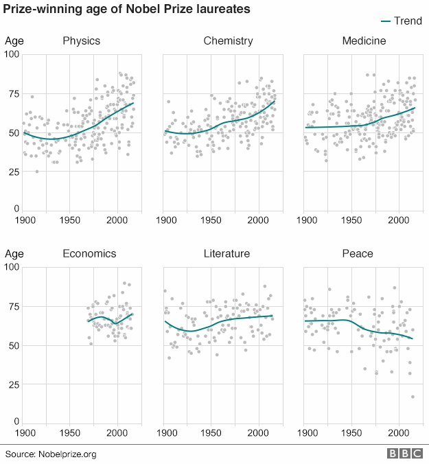 可以看出,传统基础科学的诺贝尔获奖者在获奖时的年龄,在二十世纪初现代物理大突破的年代,有诸多二十几岁的年轻人做出了概念性的突破。随着这一时代的过去,更多的是需要经验的积累,和现代科学对团队的要求,于是获奖者的年龄就越来越大,而以物理为尤其突出,说明在新发现方面已经有很长时间这并不是一个出成果的方向。