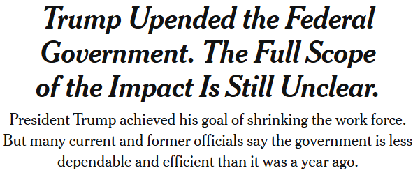 这些变化迄今对公众产生的影响仍不明朗。白宫的一些举措因大量诉讼而受阻——目前已有200多起诉讼针对联邦雇员被解雇、拨款被冻结以及项目被取消提出挑战,其中绝大多数案件仍在审理之中。此外,各联邦机构尚未全面披露被裁减的人员数量和服务项目,这使得外界难以准确判断当前的联邦政府与一年前相比究竟发生了多大变化。