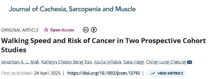 2025年6月,国际期刊《恶病质、肌少症和肌肉杂志》的一项研究整合了两大权威队列的数据——英国生物样本库(UK Biobank)和香港骨质疏松症研究(HKOS),纳入43.1万名欧美成年人和1311名中国成年人。结果发现,无论哪个群体,走路快的人患癌风险都更低。